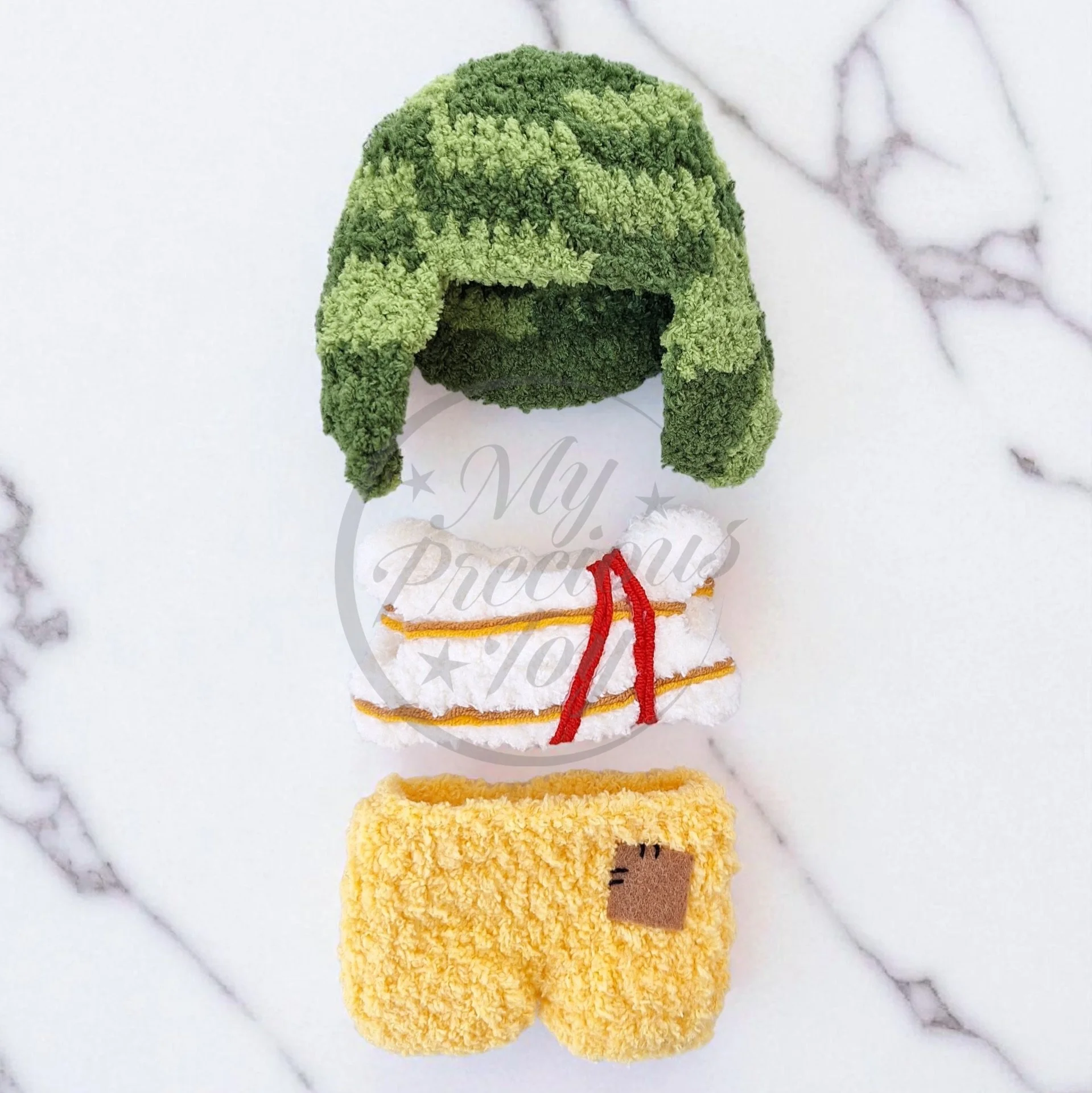 A cozy three-piece outfit inspired by El Chavo, featuring a green striped fleece hat with ear flaps, a white top with yellow and red detail, and fuzzy yellow shorts with brown patch.